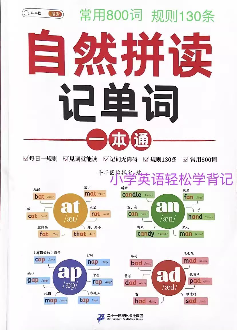 斗半匠小学英语自然拼读记单词一本通,汇总了常见的130多条自然拼读规则,包含800+常用词汇。每页一个字母发音规则,通过口诀记字母发音规律,通过规则记对应单词。